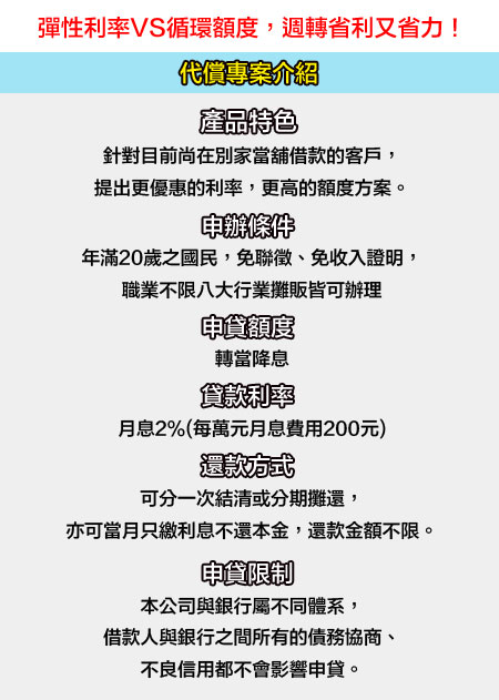 2.利息(以當舖法規定為準) : 月息最低1%~最高2.5%[年利率最低12%最高30%] (提早結清以日計算,無違約金)
